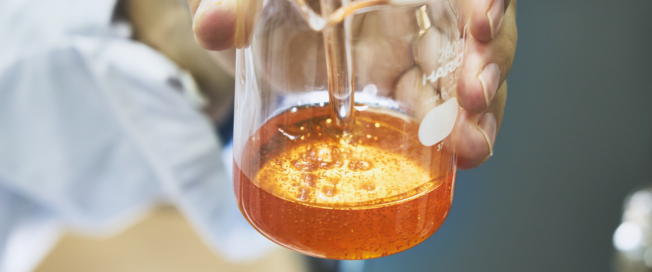 いざマイクロカプセルを配合すると、カプセルが液の中沈んでしまう問題が発生しました。カプセルが沈まないようにするには、液の粘度を上げることが有効なのですが、粘度を上げると使用感が変わり、肌になじみにくくなってしまいます。