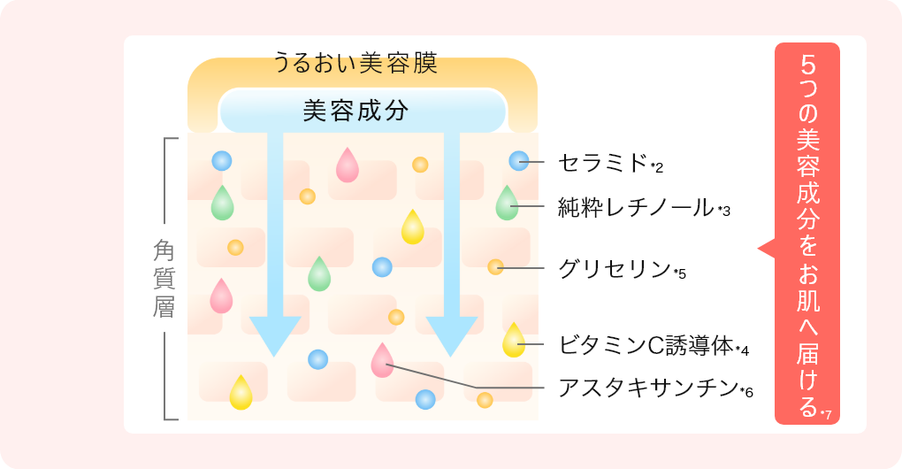 *1 DETAILSに記載の5つの成分のこと *2 セラミドNG(保湿、皮膚の保護成分) *3 レチノール(整肌成分) *4 リン酸アスコルビルMg(整肌成分) *5 (保湿、皮膚の保護成分) *6 (整肌成分) *7 角質層まで